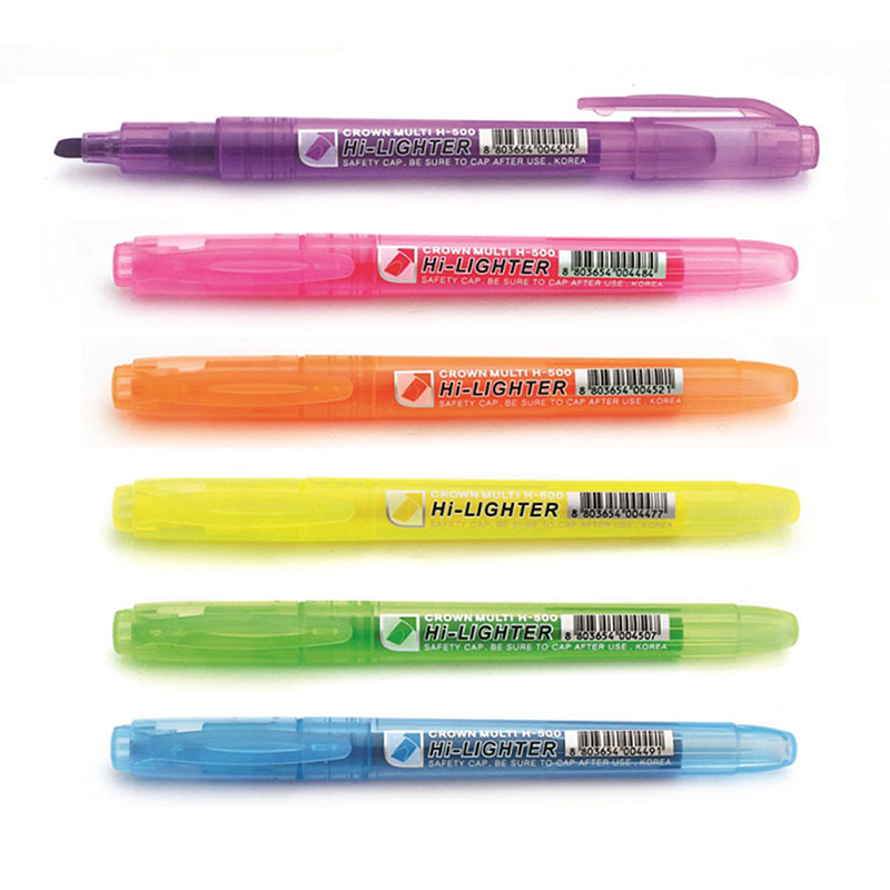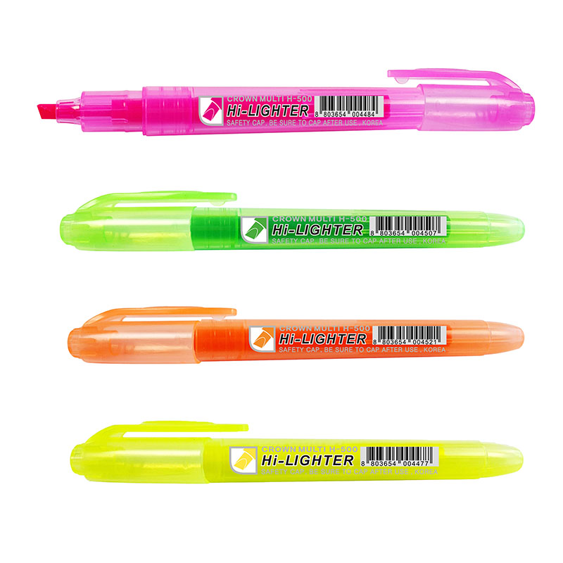 The CROWN H-500 Highlighter uses bright fluorescent inks that are fade resistant and have an excellent laydown. The streamlined barrel is stylish with its opaque finish as per ink colour, safety cap with clip and chisel tip.