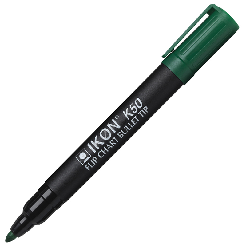 The IKON K50 is a bullet tipped flipchart marker with a large capacity barrel. The ink is cap off and non bleed through. Ink colour is denoted by the markers cap.