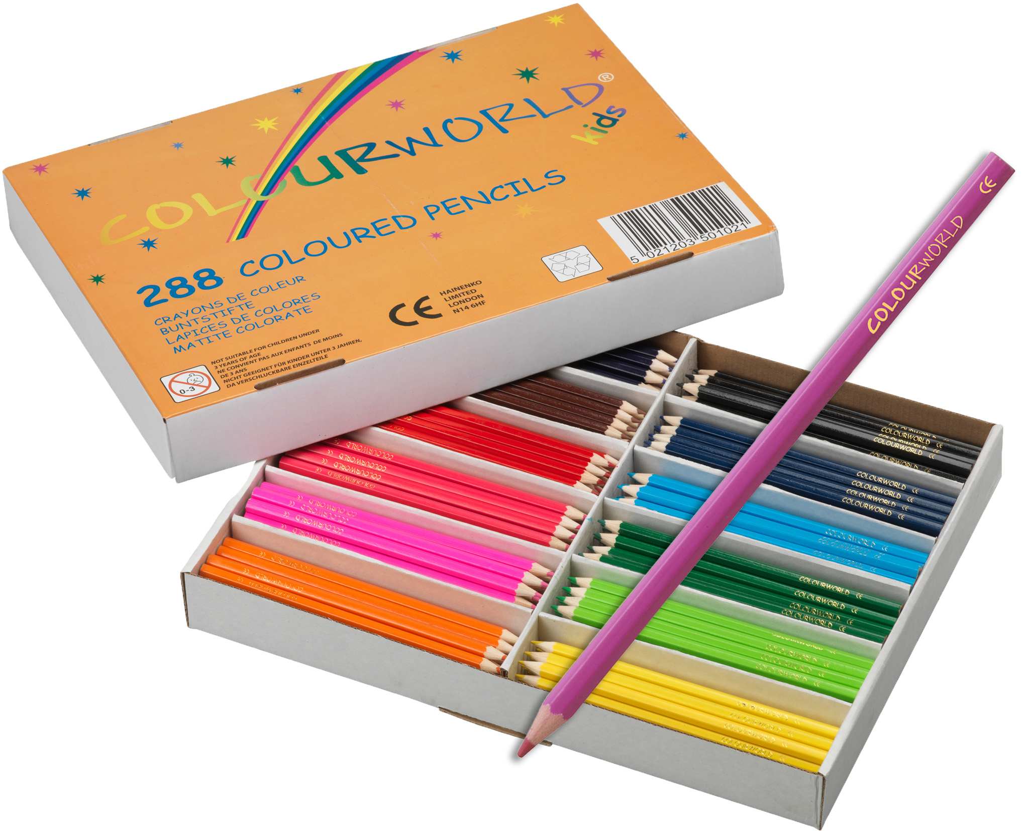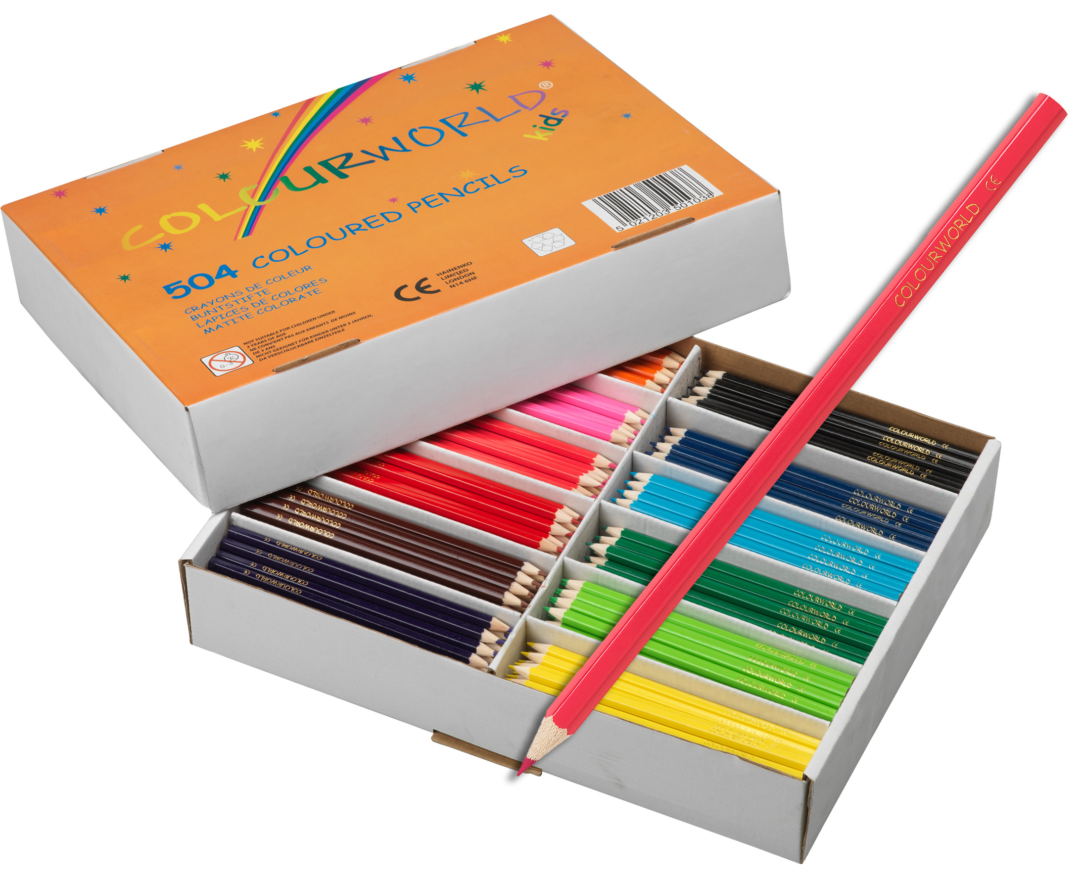 The Colourworld Pencils are full size and contain an assortment of coloured leads. The pencil conforms to EN71 regulations, and the larger pack sizes are ideal for school use. Packed in 12 inner boxes of 12.
